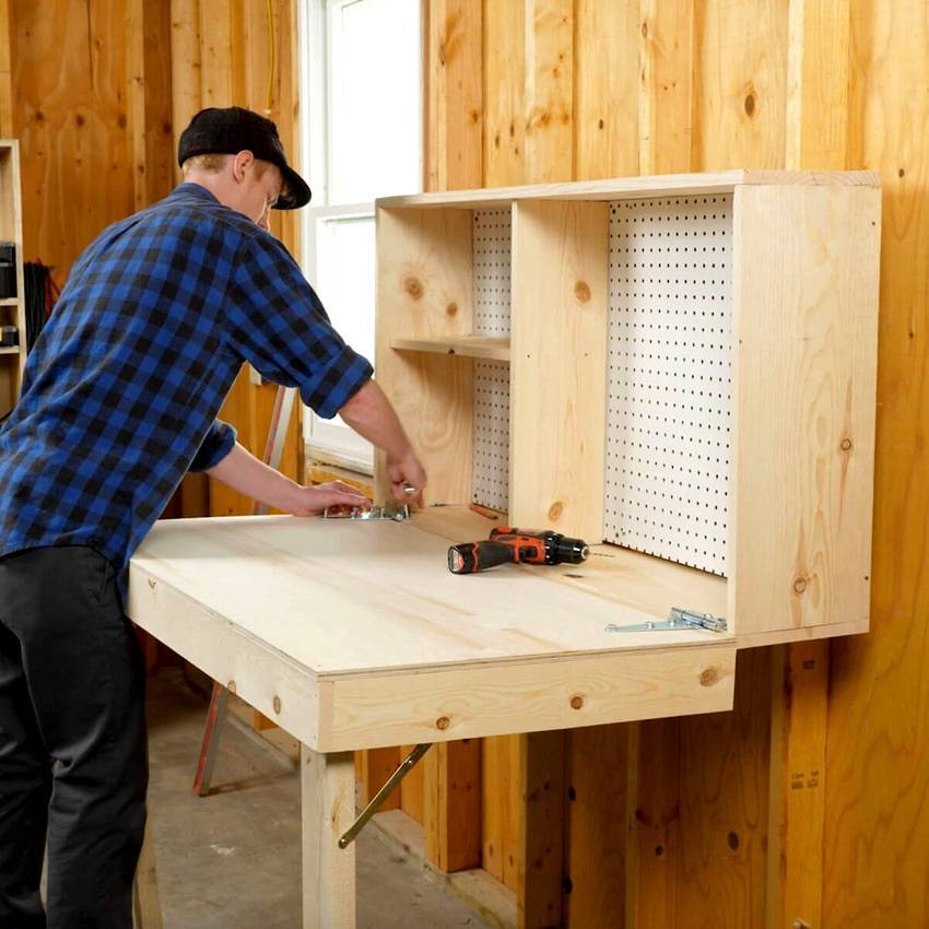 Самодельный стол может иметь как металлическую, так и деревянную систему хранения. Дополнительный металлический щит позволяет хранить здесь мелкий подвесной инструмент. Теперь ножовки и молотки будут располагаться в одном месте.