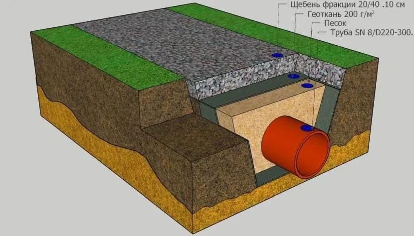 На этом этапе сначала укрепляются стенки канавы. Они должны создавать в поперечном сечении рва перевернутую трапецию. Далее выкапывается прямоугольная траншея на достаточную глубину, чтобы вся вода проходила через трубу. Грунт здесь стоит дополнительно утрамбовать. Стенки и дно с целью упрочнения укрываются прочным геотекстилем.