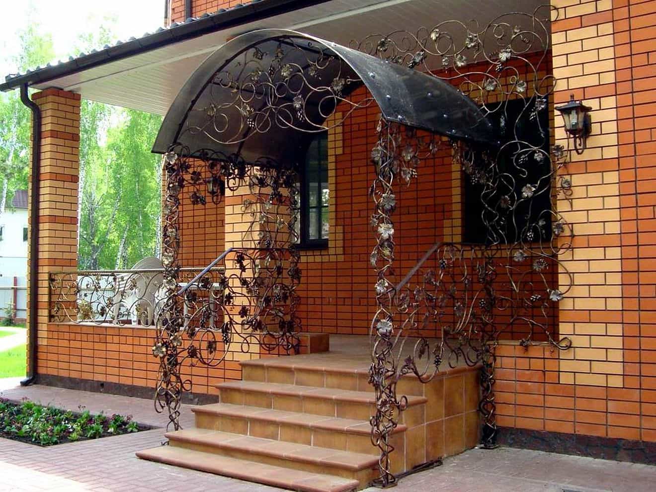 Настоящим украшением крыльца выступают кованые перила. Ограждения выполняются из обычного прутка, а затем украшаются литыми или коваными деталями. Такого рода элементы своими руками не выполнить. Такие же фрагменты используются для дизайна навеса, если он установлен на металлокаркас, и даже опорных столбиков, если они изготовлены из железа.