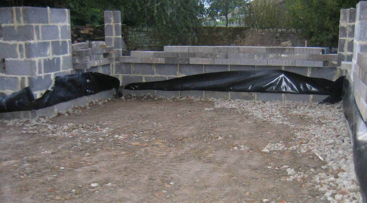 Если грунтовые воды находятся близко или грунты имеют свойство пучинится, то делается горизонтальная и вертикальная гидроизоляция фундамента пенополистиролом, нижний край стен обмазывают мастикой.