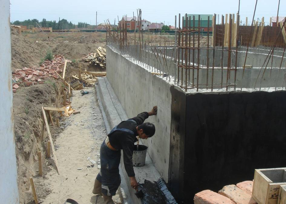 - Далее наносится одним слоем мастика. Данный материал повышает адгезию между основной гидроизоляцией и фундаментом.