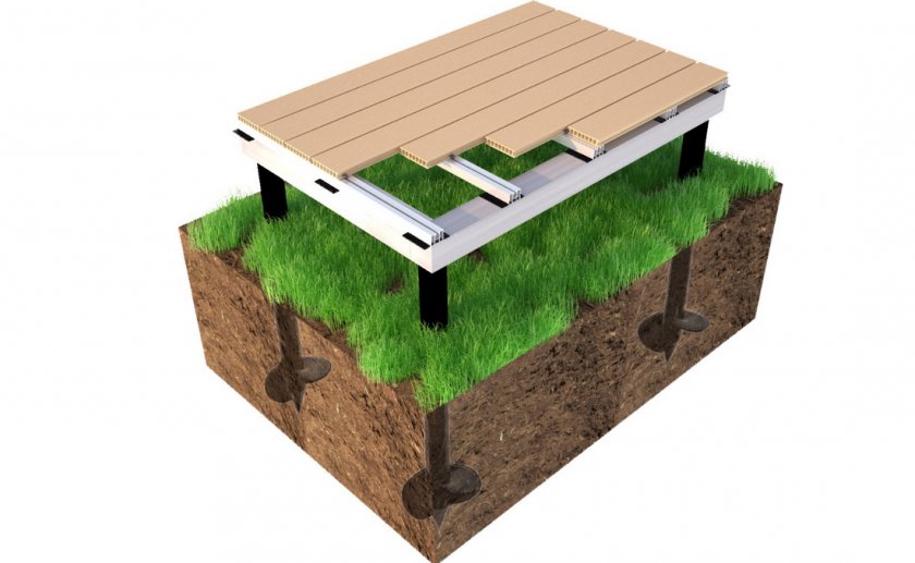 В этом случае применяются специальные винтовые сваи, на которых будет установлен сварной каркас, сверху будут смонтированы лаги, на которые устанавливают террасные доски. Винтовые сваи позволяет быстро и надежно сделать фундамент под будущую террасу. Винтовая свая представляет собой цилиндр, который имеет на конце лопасти, вкручиваемые в грунт. После этого винтовая свая заливается бетоном и получается надежная конструкция для фундамента.