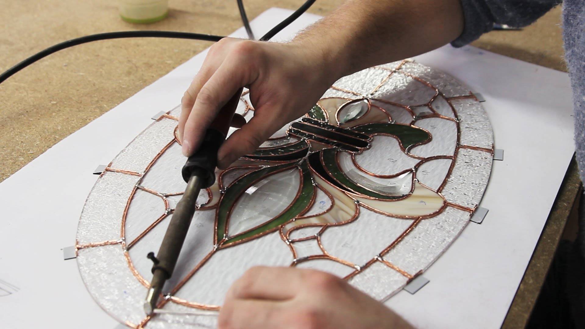 По окончании работы все стыки прижимаются специальным прижимом, поверхность тщательно протирается моющим средством. Витражная картина готова.