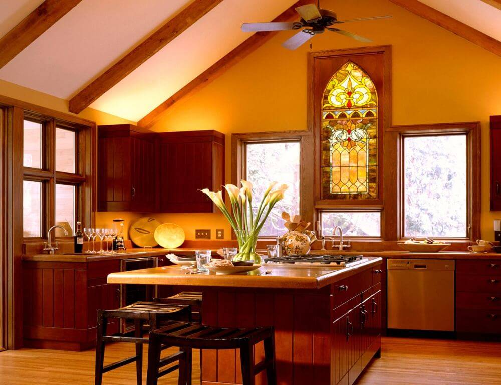 В интерьерах современных домов часто используют витраж для кухни. Витражи привнесут атмосферу радости и в общение с гостями, и в ежедневные семейные трапезы. Оригинальным и самостоятельным элементом интерьера могут стать витражные кухонные фартуки.