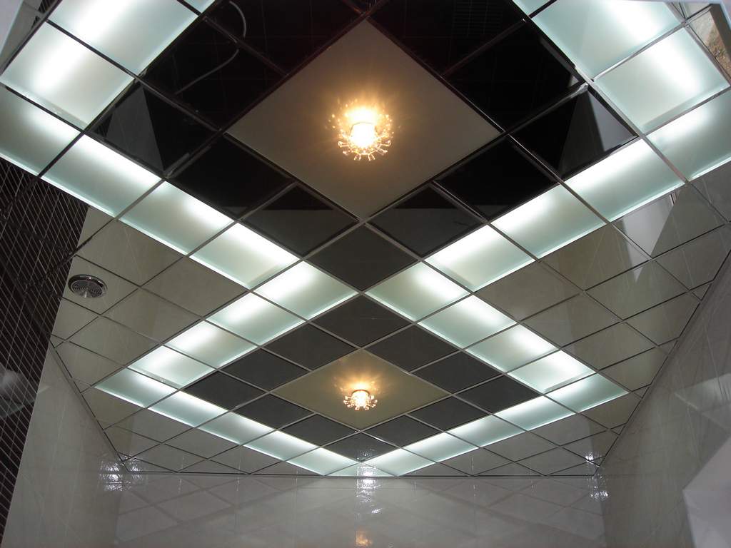 Зеркальная плитка на потолок может использоваться в подвесных системах Армстронг. Если применять плиты разной расцветки, прозрачности, фактуры, а также элементы с узорами, можно создавать красивые светопропускающие покрытия со скрытой подсветкой. По сути, это настоящие композиции с разными вариантами освещения в запотолочном пространстве. Освещенность потолка можно менять в зависимости от ситуации.