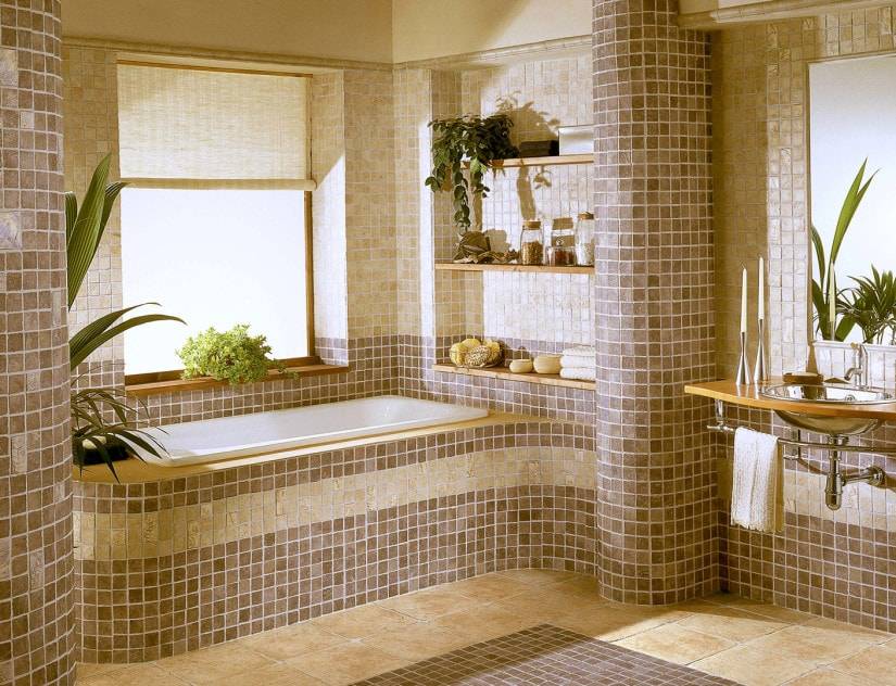 - Плиточные – изготавливаются в виде квадратов самых разных размеров. Такие панели «под плитку» используют в качестве декоративной отделки потолков и стен в ванной комнате. Их главным достоинством является то, что можно довольно легко сочетать элементы между собой, которые могут быть разной окраски и текстуры. Плитку можно укладывать разными способами, например, в шахматном порядке, послойно или создавая разнообразные геометрические фигуры. Это придает ванной комнате очень оригинальной вид.