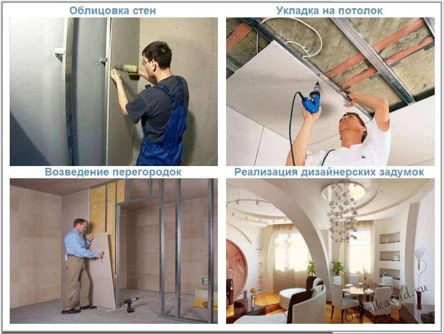 Используется ГКЛ для «сухого» выравнивания стен или обшивки каркасов при каркасном домостроении. Пригоден для внутренних работ, для наружных слишком хрупкий. Используют гипсокартон для стен, перегородок, потолков.