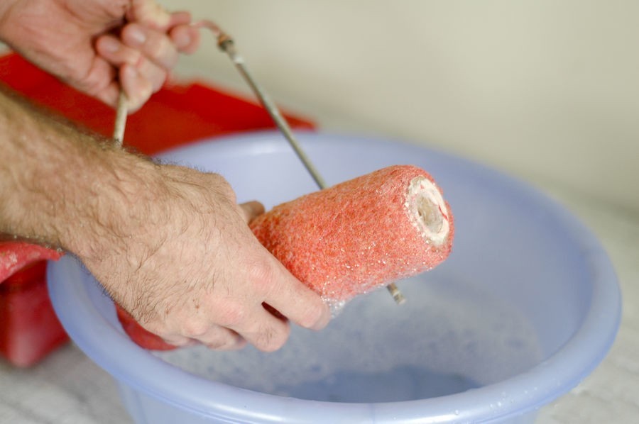 Краску наливают в лоток с рифленым дном. В нее опускают валик с короткими волосками, а после набора вещества убирают излишки отжимом по рифленой поверхности.