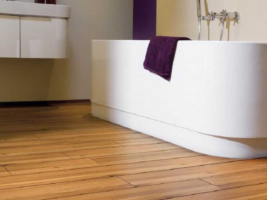 Продукт, который подходит для укладки в помещении ванной, отличается от обычной доски более высокими характеристиками устойчивости к влаге. Он не разбухает, не размокает, а при качественном монтаже вода не проникает внутрь сквозь швы замочного соединения. Существует два варианта ламината, подходящего для укладки в санузлах.