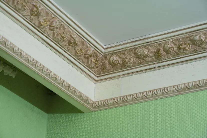 - Такие декоративные вставки закрывают одновременно проем в багете и между стеной и потолком.