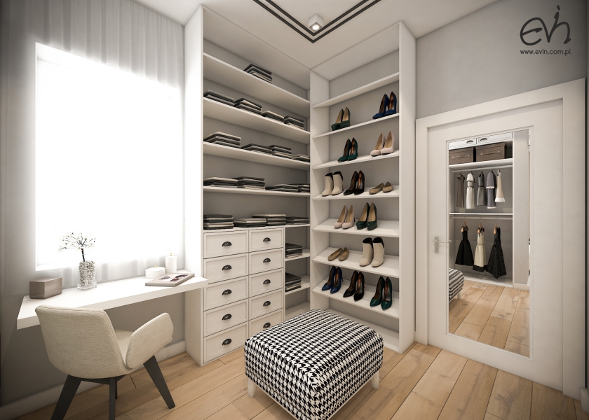 В гардеробной должны быть и полочки, и вешалка, и выдвигающиеся ящички, чтобы не было проблем с размещением и поиском вещей.
