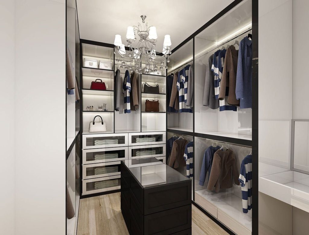 - при необходимости гардеробную можно отделить перегородкой: лучше всего использовать конструкции из закаленного стекла, чтобы обеспечить визуальную доступность системы хранения;
