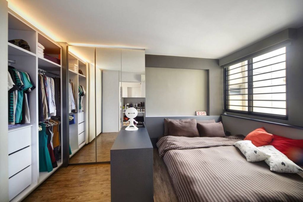 Если позволяют размеры спальной, то под зону хранения можно выделить место вдоль одной из стен, разделив пространство перегородкой или раздвижными дверями.