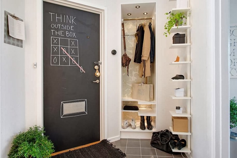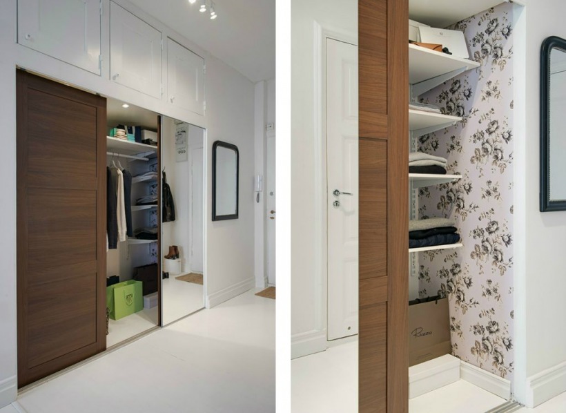 В такое пространство площадью от 2 до 3 кв.м можно вместить ящички, вешалки и стеллаж, а свободную стену оформить функциональным зеркальным полотном.