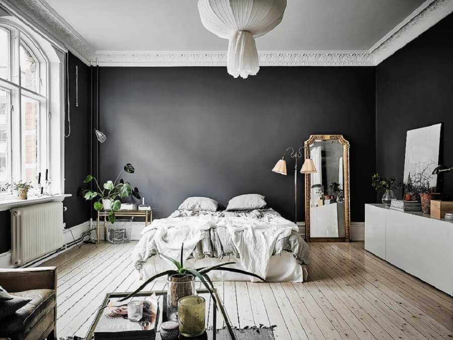 Еще один действенный и оригинальный прием – это игра теней в интерьере с помощью поверхностей, выполненных в темной палитре. Он используется в светлых монохромных помещениях или комнатах, чрезмерно насыщенных яркими оттенками. Темные обои на стене позволяют подчеркнуть характерные особенности интерьерного направления.