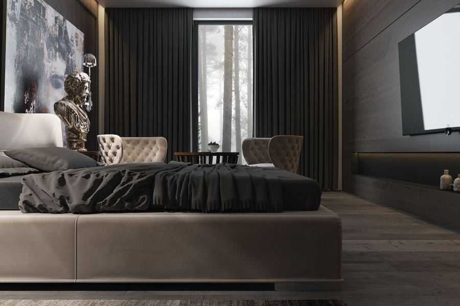 Пользуется популярностью мебель темных оттенков: коричневая, серая, черная. Для начала стоит выбрать кровать, после к ней уже подбирать остальные фрагменты.