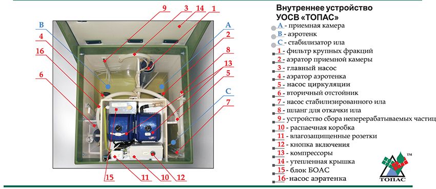На втором месте по популярности находится «Топас». Он идеально подходит для выгребных ям загородных домов. За сутки эта компактная система способна переработать более 20 литров отходов, что почти в 2 раза больше, чем у аналогов. В зависимости от потребностей, возможно вертикальное и горизонтальное размещение.