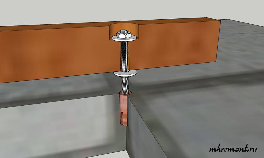 В полу сверлят отверстие и устанавливают анкер. В него вворачивают шпильку. На нее накручивают гайку и одевают шайбу. Верхняя гайка служит для фиксации бруска. После окончательной установки лаг выступающую над ней часть опоры срезают.
