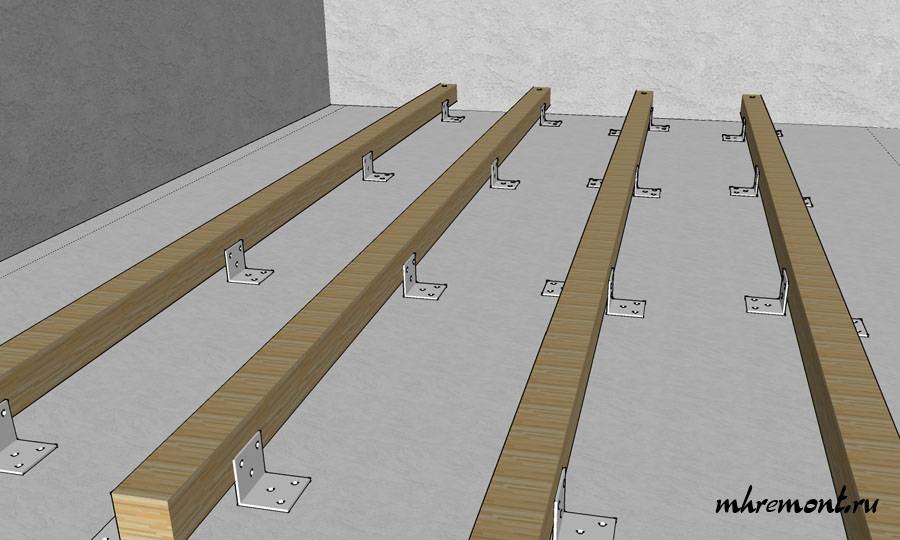 По линии установки лаг с шагом 50 см закрепляют металлические уголки. К ним крепят бруски одновременно выставляя их на требуемый уровень. Эту работу удобно выполнять вдвоем.