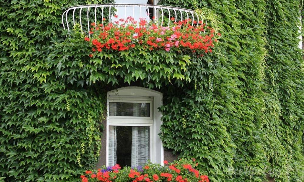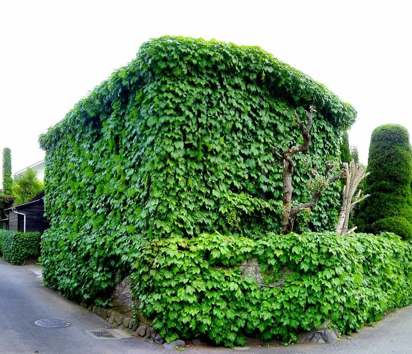 - Девичий виноград с густой листвой, отлично прячущейся от жары, ниспадающими и вьющимися стеблями, способными подниматься до 20 м;