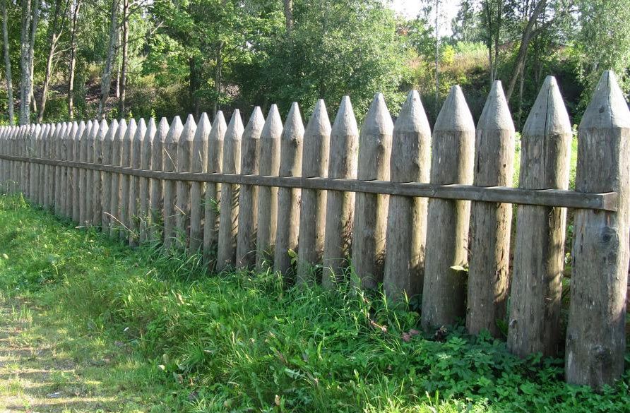 - Частокол – ограда из кольев, вбитых в землю вплотную друг к другу. Часто его делают из брёвен. Сложный в возведении, но прочный и долговечный.