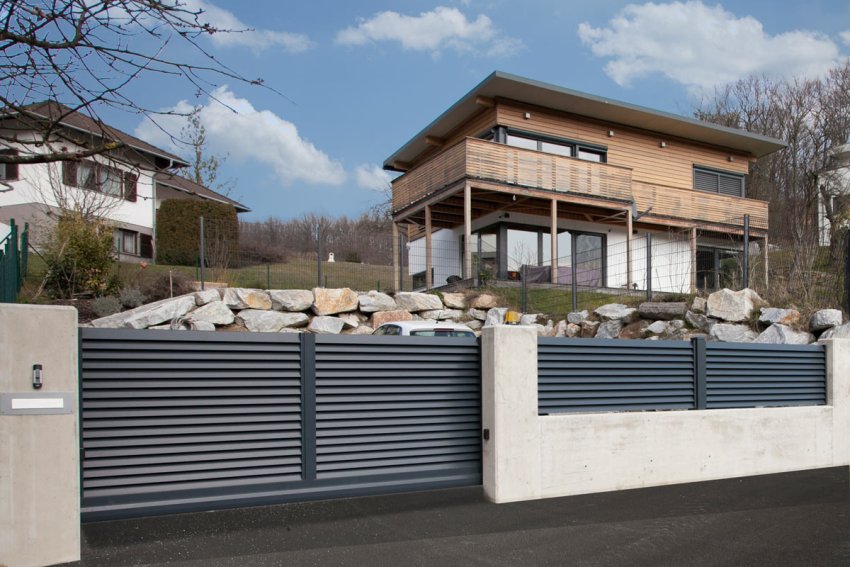 На фотографии представлено металлическое заграждение типа жалюзи для частного дома.