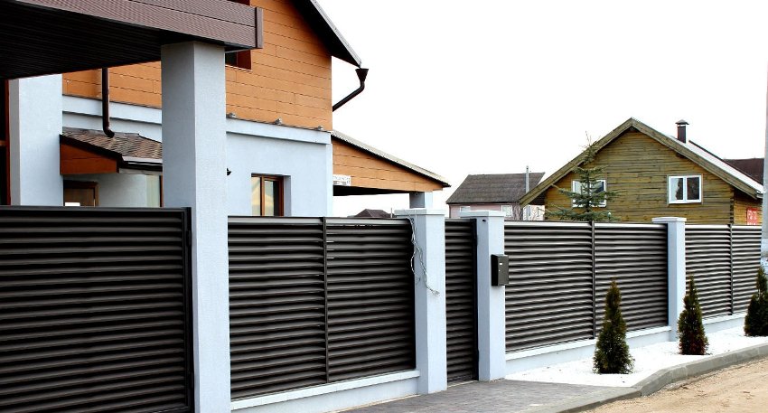 - Жалюзи из металла. Такие заборы сложно устанавливать самостоятельно. Это обусловлено тем, что для создания ламелей потребуется оборудование, необходимое для выгибания оцинкованных листов. Помимо этого, металлический штакетник жалюзи требует сгибания и других частей конструкции.