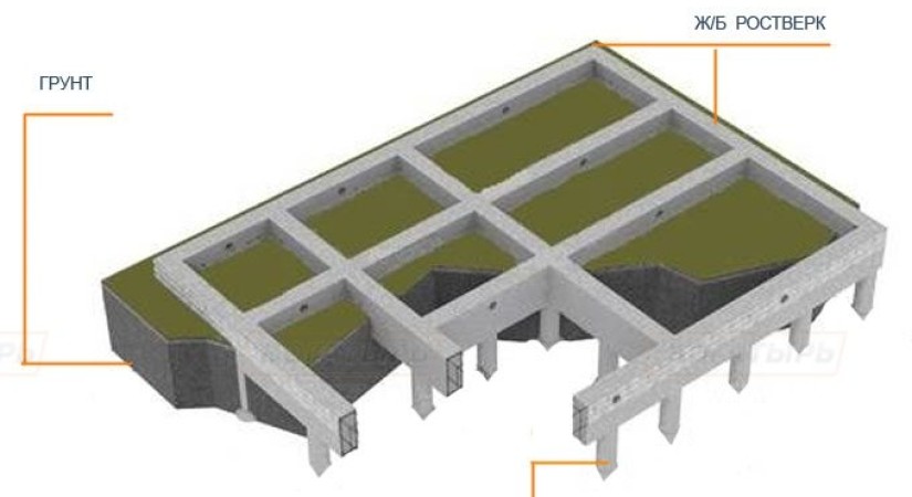 Ребра жесткости в данном случае представляют собой фрагменты мелкозаглубленной ленты под несущими стенами сооружения, которые вместе со сваями являются опорой для монолита.