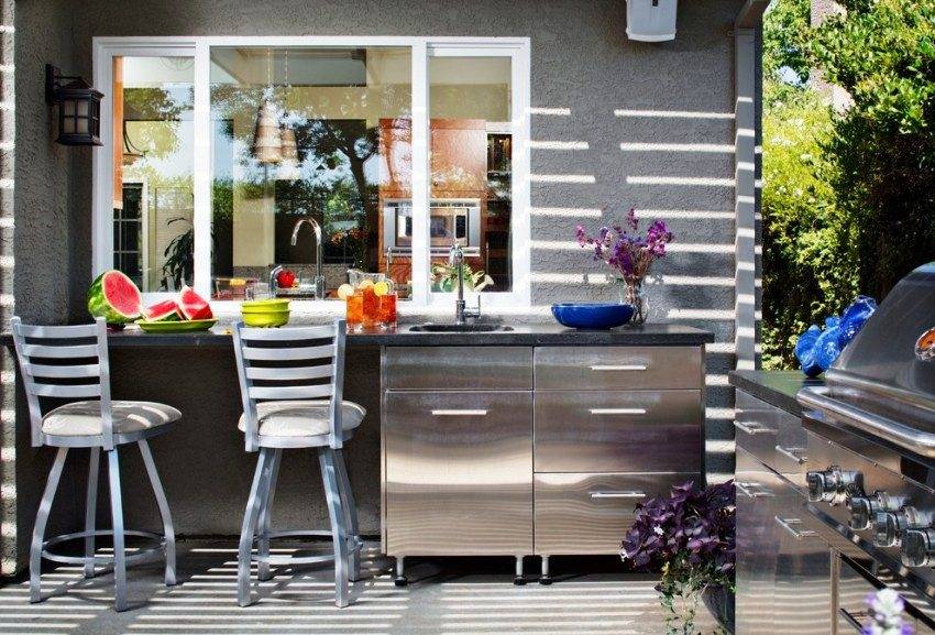 Если при необходимости большую часть закрытых поверхностей можно открыть, а в прохладную или дождливую погоду соответственно закрыть, такая кухня будет универсальной и востребованной в любую погоду.
