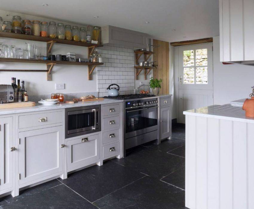 Можно использовать для летней кухни и обычные отделочные материалы: линолеум, ламинат, керамическую плитку. В самом простом варианте линолеум может быть положен просто на бетонную стяжку. Кроме того, пространство вокруг плиты выкладывается плиткой в любом случае, из соображений пожарной безопасности.