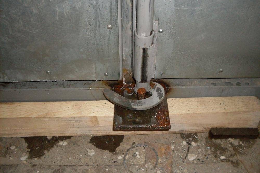 К верхнему и нижнему концам трубы приваривается массивный крюк. Толстые и короткие вставки монтируются на порог и на верхнюю балку коробки гаражных ворот. При вращении трубчатой стойки крюк вращается вокруг вертикальной оси и входит в зацепление с цилиндром вверху и внизу ворот.