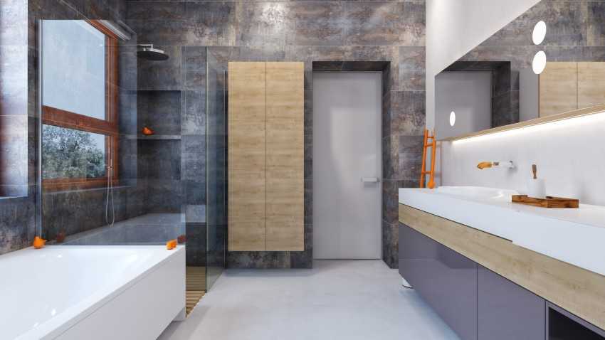 При выборе дизайна ванной можно использовать различные направления и предпочтения владельцев. Одним из оригинальных решений выступает сочетание мозаики и плитки больших размеров. что касается мозаики, то она отличается высоким уровнем прочности и длительным сроком службы.
