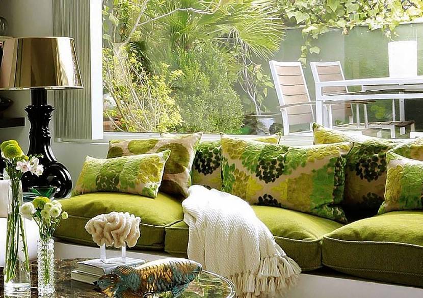 - Декор в зелени позволяет добавить комнате гармонии, не затрачивая больших средств. Шторы, покрывала, подушки, коврики, коврики в травяных тонах положительно влияют на психологическое состояние: успокаивают, расслабляют.