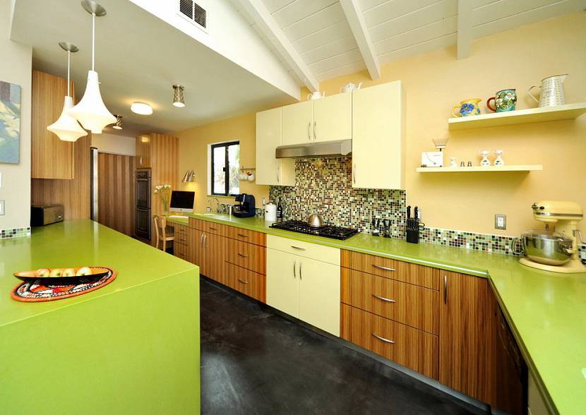 - Пробуждает аппетит, способствует созданию приятной атмосферы для спокойных завтраков, обедов и ужинов. На кухне в этом цвете отлично смотрятся кухонная мебель, фартук, стенки, диван или стулья, стол, аксессуары — скатерти, прихватки, салфетки, полотенца.