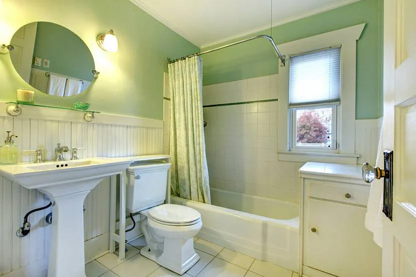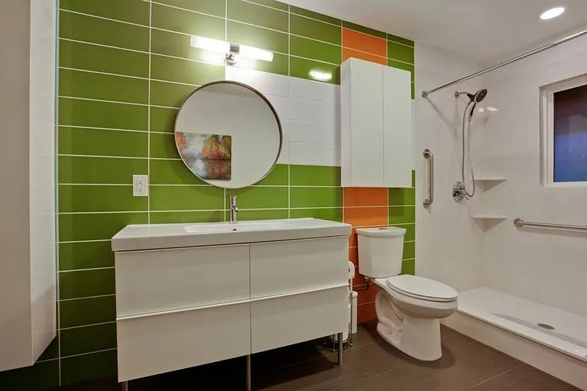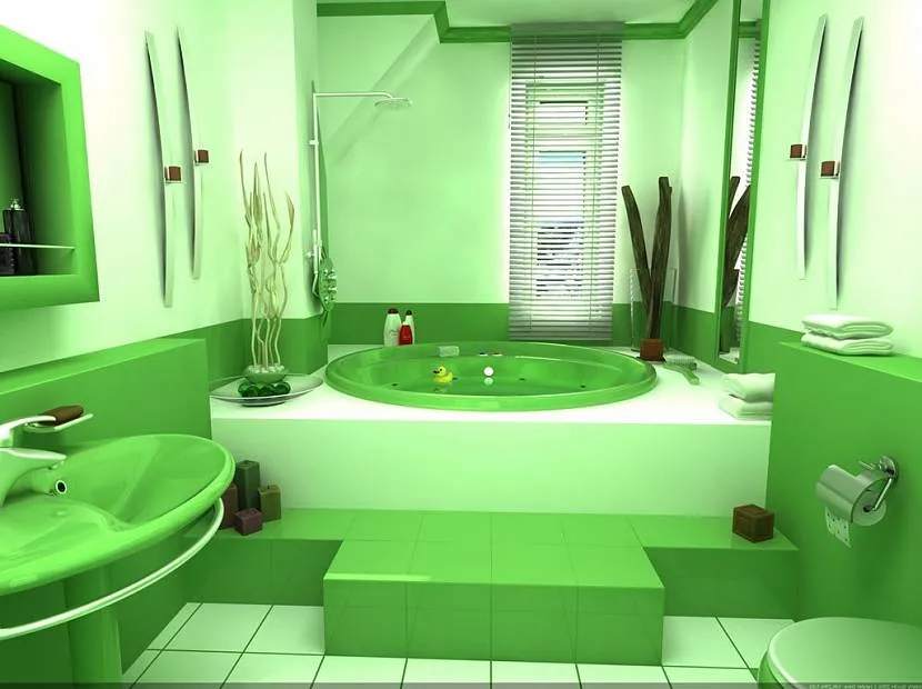 Если сантехника белая, то можно использовать темные оттенки зелени, например, малахитовый, изумрудный, морской волны.