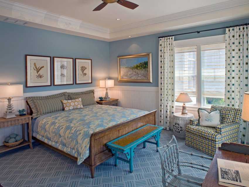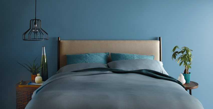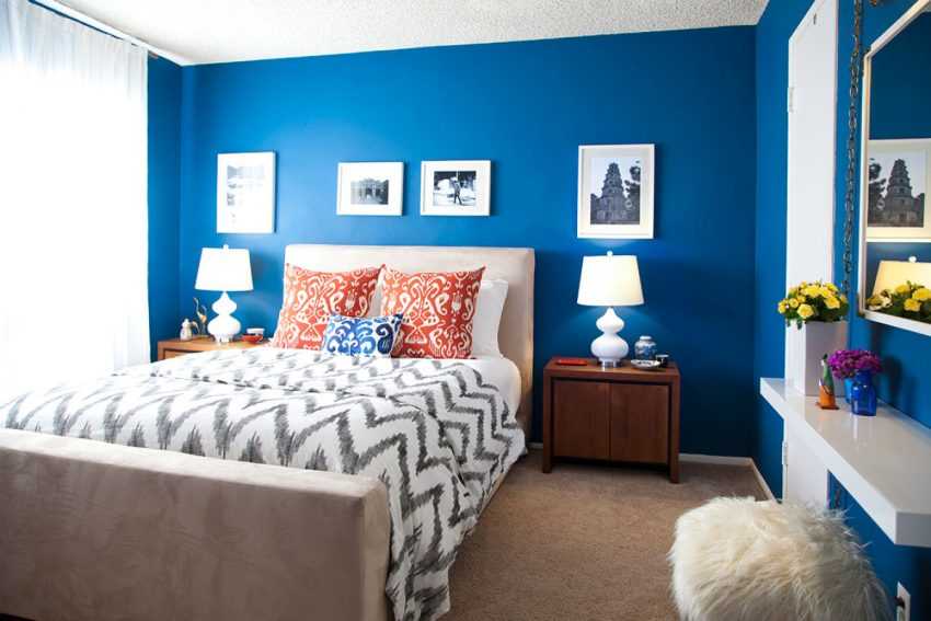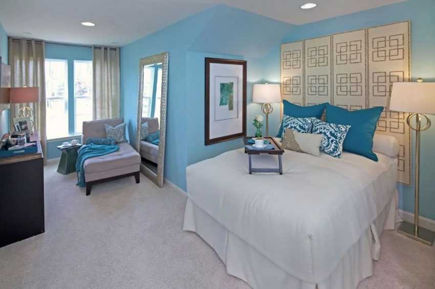 При проектировании маленькой спальни, безусловно, разумнее всего будет обратиться к ярким оттенкам, например, к голубому, который оптически расширяет интерьер. Если у спальни большая площадь, можно выбрать более темный цвет, например, темно-синий.
