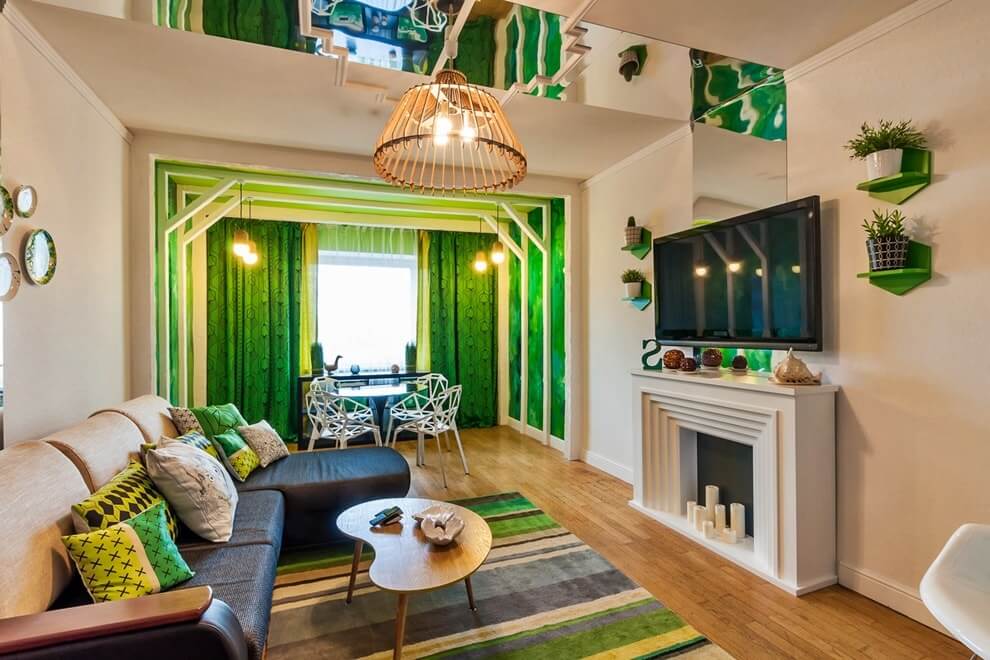 Использование салатовых оттенков с другими природными тонами на стенах в зале помогает перенестись в природную обстановку, расслабиться и настроиться на позитив, поэтому нередко именно эти оттенки используют для создания ярких и живых акцентов.