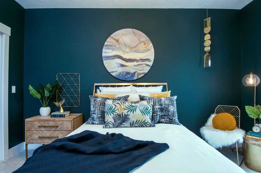 Можно окрасить изумрудной краской стену у изголовья кровати или хотя бы часть стены.