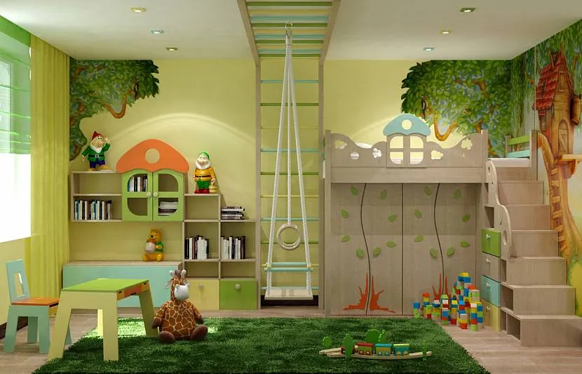 Поиграв с тональностью салатовых цветов, вы сможете создать гармоничные переходы между разными зонами: светлые салатовые тона украсят зону отдыха, а яркие – игровую часть интерьера.