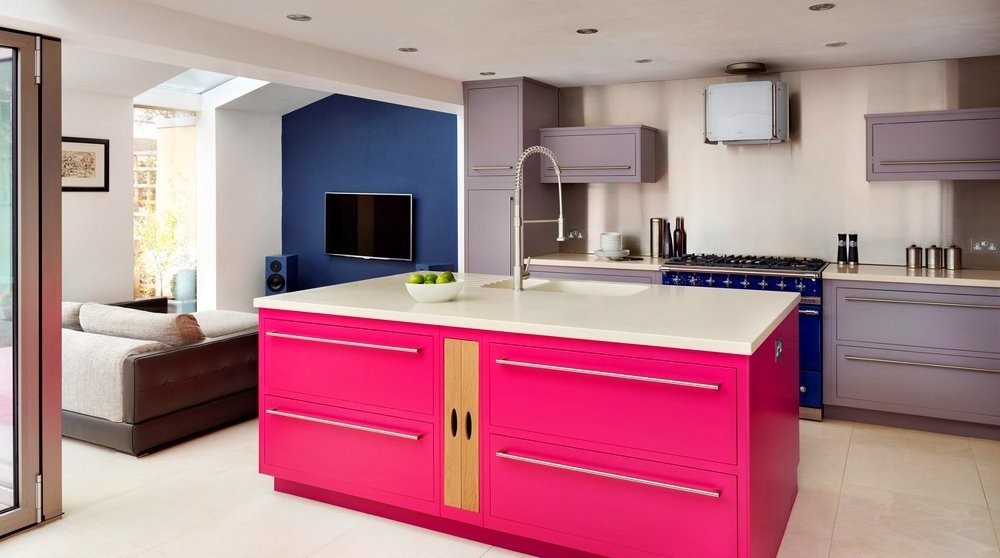 Кухню в розовых красках оформляют не так часто, этот цвет считается девичьим, но ведь нюансов розового множество: от трендового пудрового до фуксии и винно-розового. Это один из самых ненавязчивых и мягких тонов, он улучшает настроение, пробуждает аппетит, снимает агрессию.