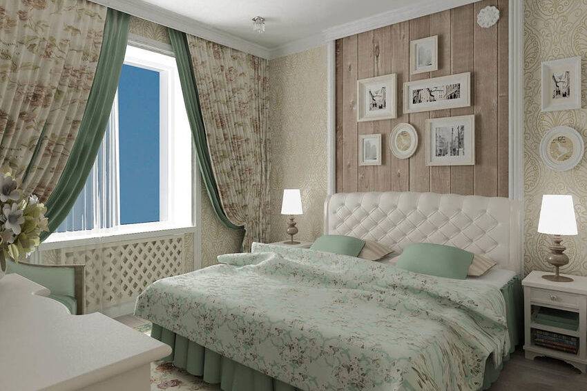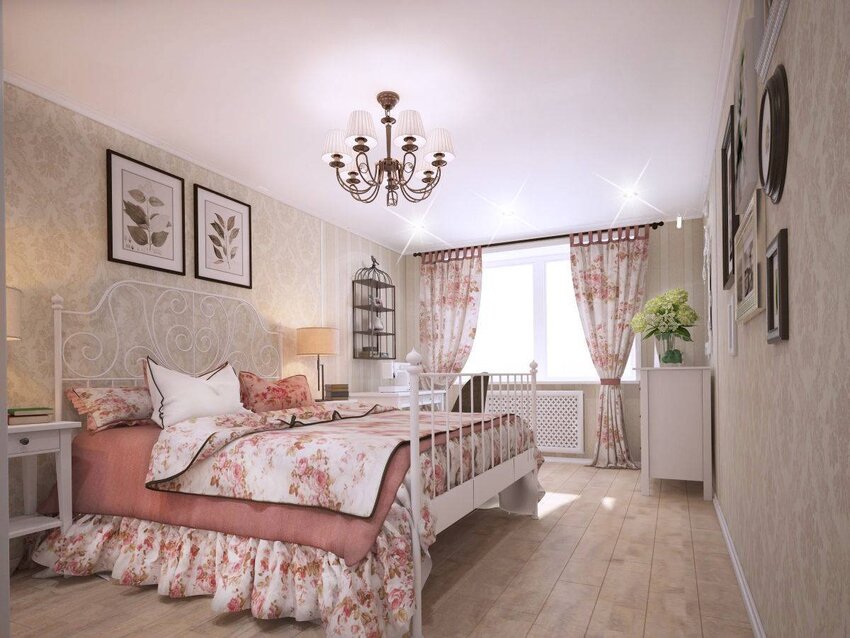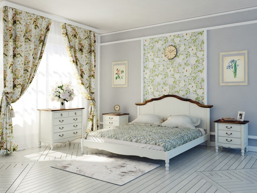 Спальни в хрущевке маленькие, и оформление их в стиле прованс нужно тщательно продумать. Стены можно оклеить обоями с изображением цветов, листьев. Если комната узкая, их лучше просто побелить. Это позволит визуально расширить пространство.