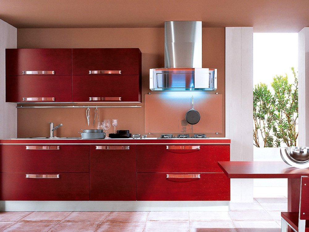 Кухня в красном цвете – яркая, насыщенная, всегда выглядит оптимистично. Вариаций красного много: вишневый, алый, марсала, винный красный – есть из чего выбрать. Чтобы интерьер не надоела и не тяготил, стоит добавить менее броские спокойные оттенки.