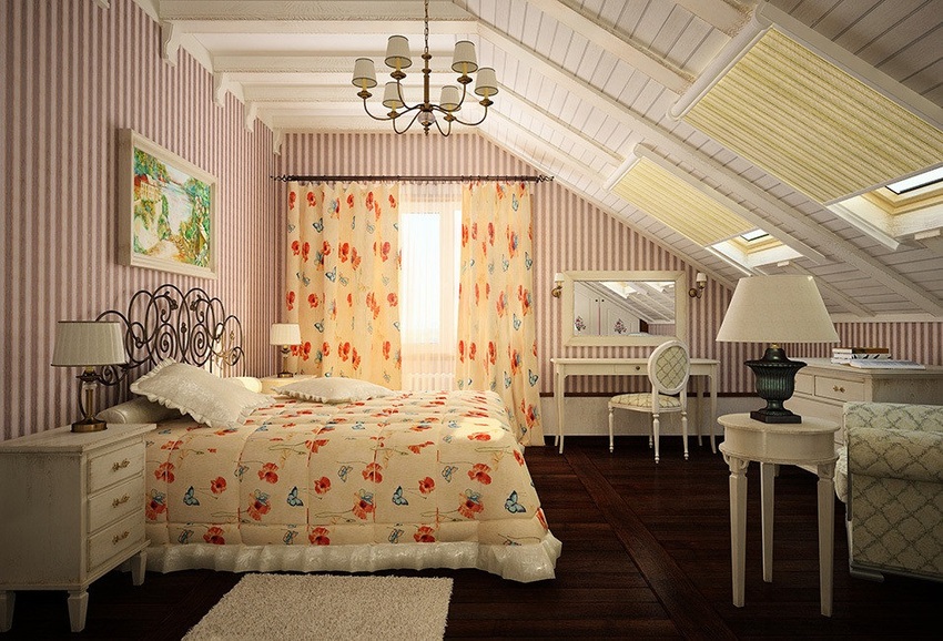 Мансарда – идеальное место для создания спальни в стиле прованс. В таком помещении обычно много больших окон и нет дорогой отделки.