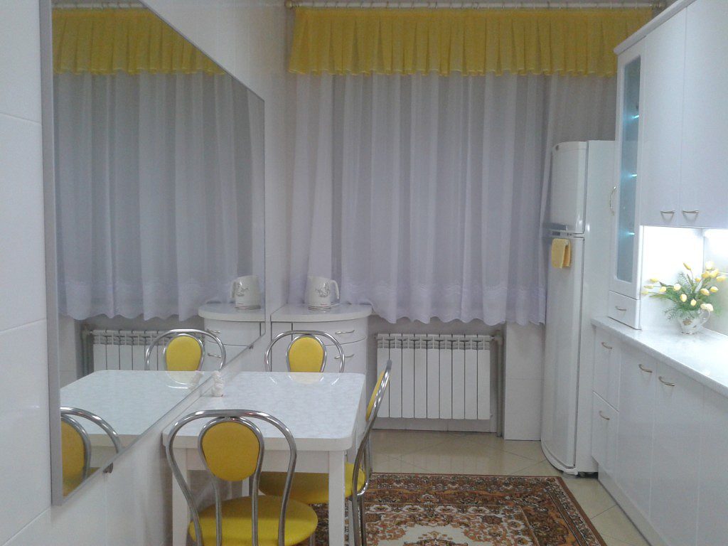 Для стен выбор лучше сделать в пользу нежно фиолетового или бледно-сиреневого оттенка. Симпатичное сочетание с жёлтой кухней создадут лёгкие шторы цвета фуксии и ковровое покрытие того же оттенка. Большую часть кухонного гарнитура желательно выбирать светлых молочных тонов. Такая уравновешенная обстановка не будет слишком яркой и не станет вызывать раздражение.