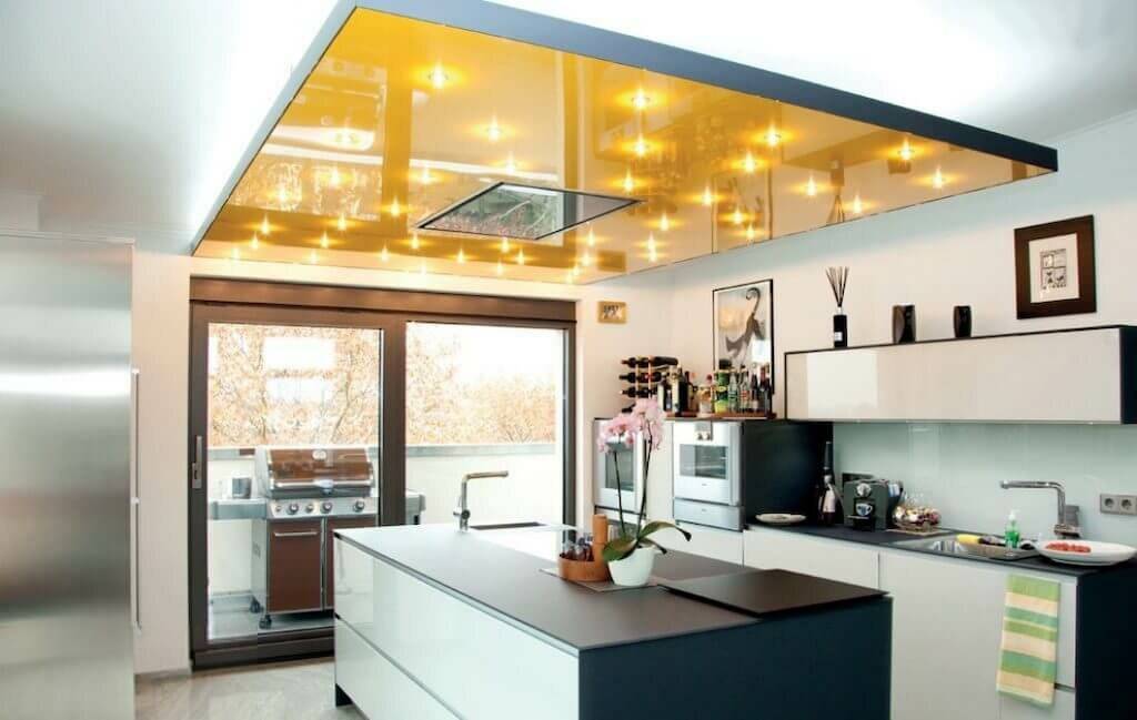 Потолок в желтых оттенках удачно смотрится с базовыми цветами кухонной мебели.