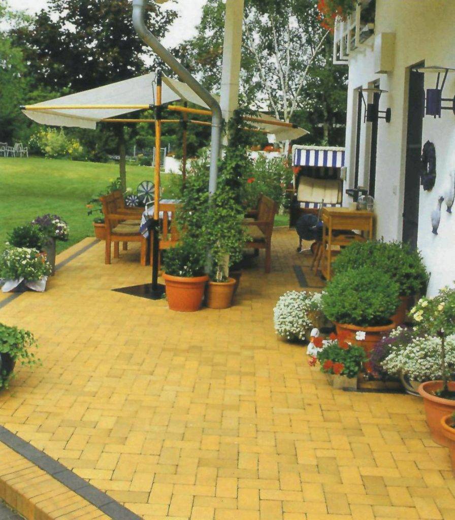 Желтый клинкерный камень брусчатки хорошо сочетается с зеленью сада.