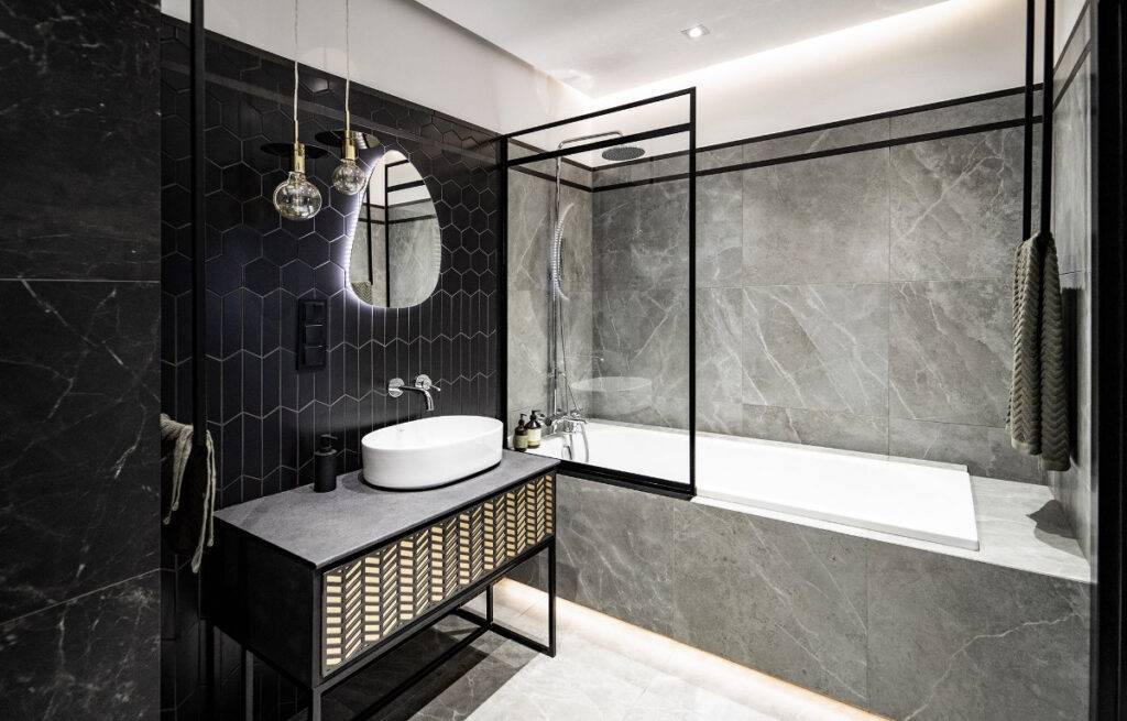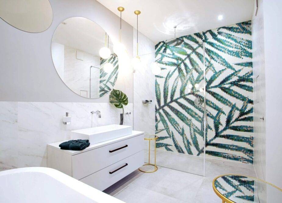 При таком расположении автор проекта столкнулся с серьезной проблемой — правильно спланировать расположение зеркал и окружающих его элементах. С этой задачей она справилась отлично — композиция сбалансирована и радует глаз.