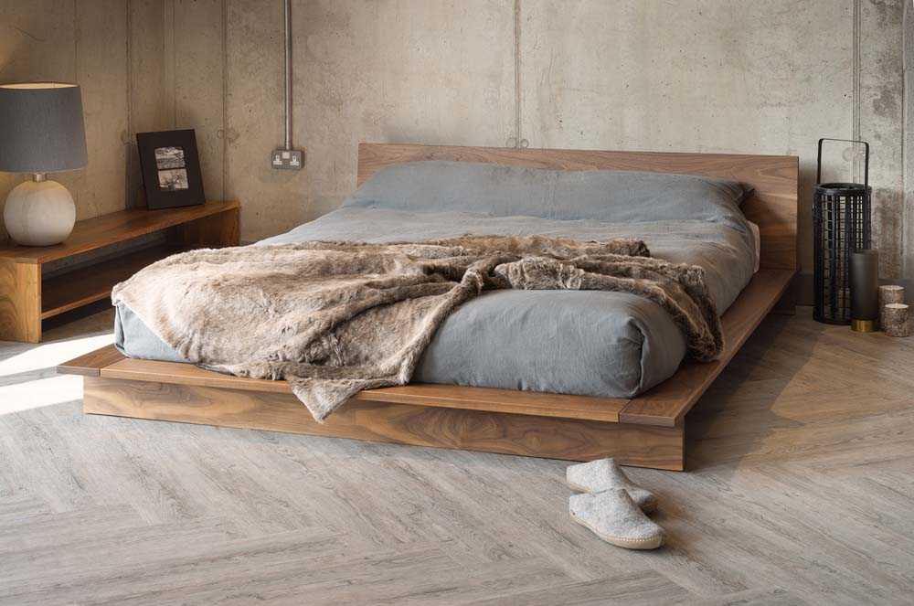 Каркас кровати может быть выполнен из дерева или железных прутьев, главное иметь четкую конструкцию без лишних элементов декора. Кровать можно лишить ножек, и это будет напоминать своеобразную нишу или же применить большие обработанные бревна светло-серого цвета.