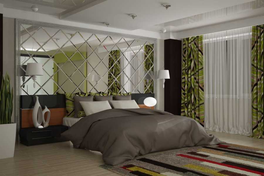 В спальне стена у изголовья идеально подходит для зеркальной поверхности
