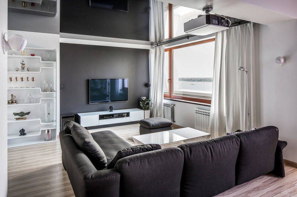 - Различные виды глянцевого полотна могут отражать помещение четко или размыто. Для оформления зала чаще всего используется максимально четкое отражение.